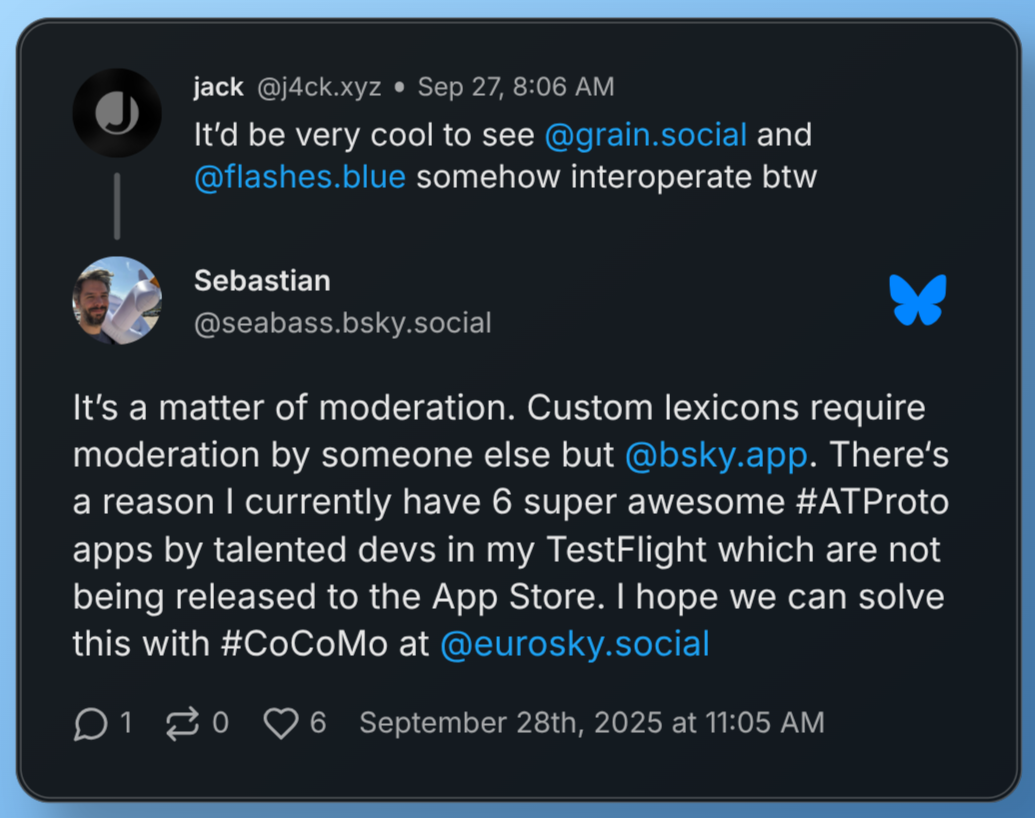 My issue currently is that the Bluesky team frequently mention apps like Skylight and Flashes as if they are their own entire applications + backend built on the same protocol. This is partially correct, but they are still hosting images, etc on the Bluesky CDN + use the Bluesky-hosted AppView. Progress is happening here, and they plan to move to their own infrastructure, but this is all in the future.